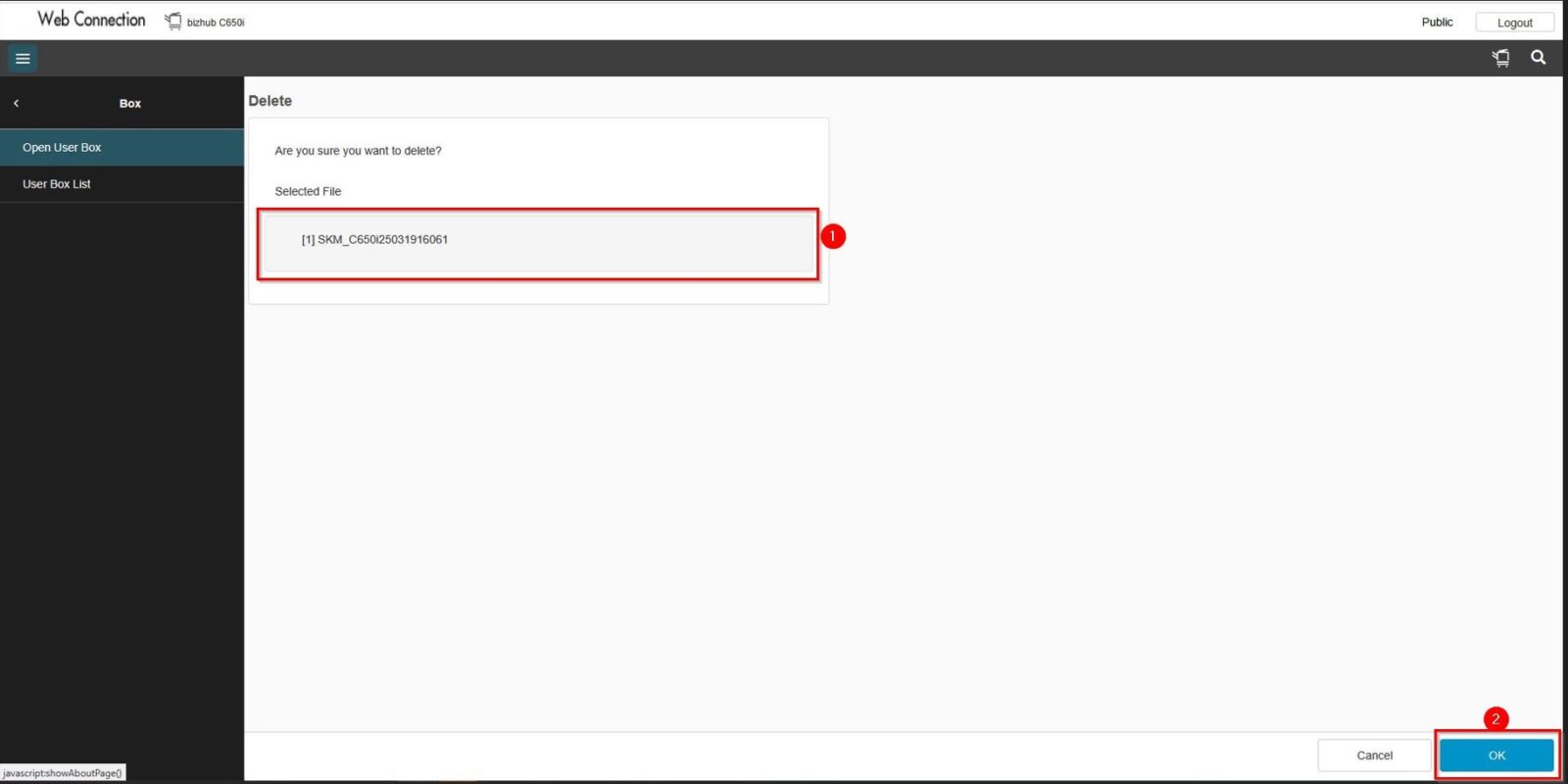 STEP 3 – Highlight the files that wish to delete, then select [Delete] and press [OK] to remove the scanned files. After that, try to scan again to the same user box.