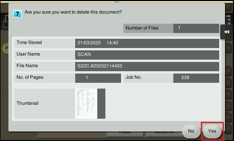 STEP 4 – Select [YES] to proceed to delete the scanned files, after that try to scan again to same user box.