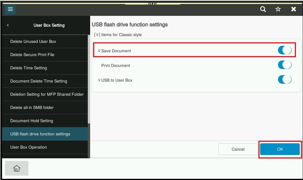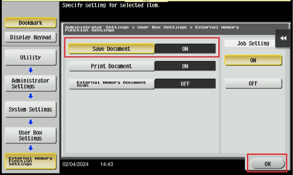 STEP 7 – Select Save Document is ON then click OK to save it, this will enable the option to Save Document to External Memory when a thumb drive is plugged in on the machine. Important Note: Only thumb drives with file type FAT32 is accepted on the machine. NTFS file type and encrypted thumb drives will not work on the machine.