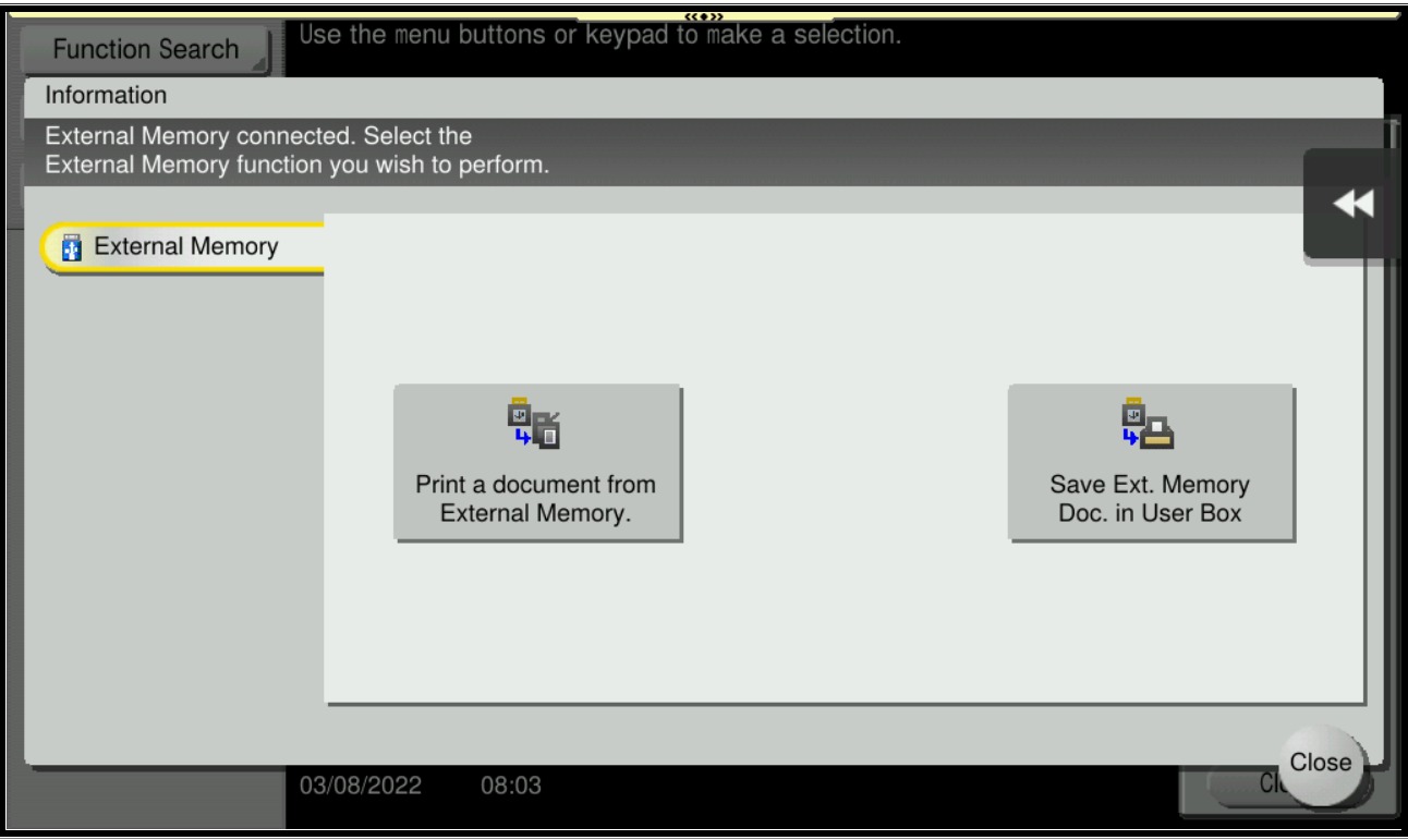 When the thumb drive is plugged in to the machine, the Save a document to External Memory is not visible. In this case, the function is not enable on machine, kindly proceed for next step.