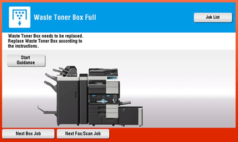 If the Waste Toner Bottle becomes full, this machine stops printing, and restarts printing after the Waste Toner Bottle is replaced. the following message appears (at replacement by the user). Tap [Start Guidance], then follow the displayed guidance to take action.