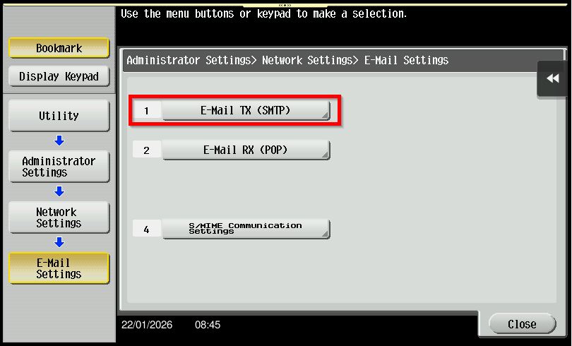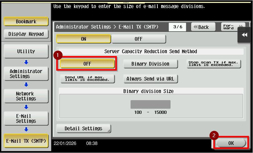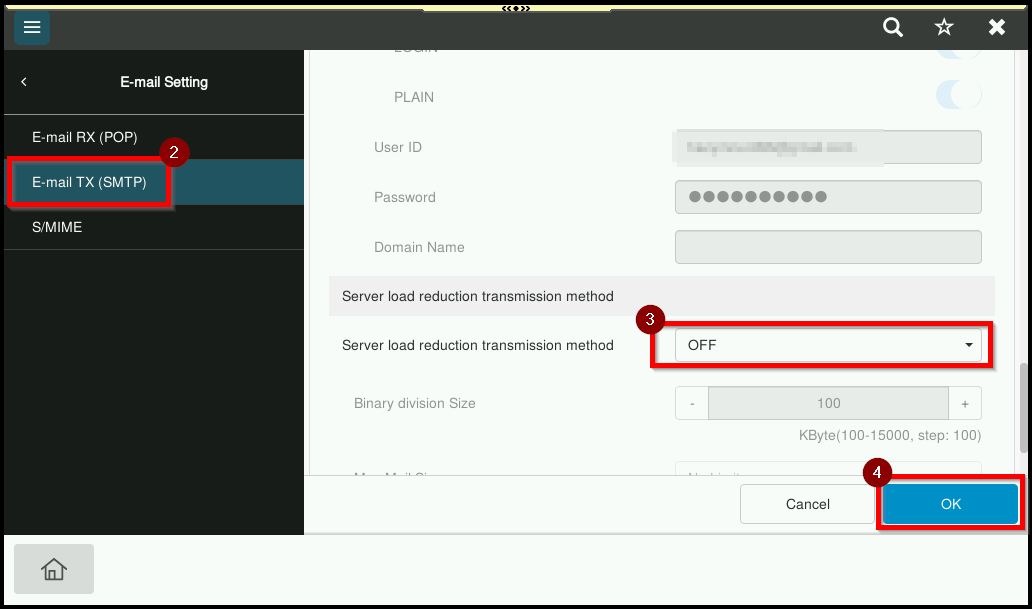 STEP 3 – Select [Network Settings] – [Email Settings] – [Email TX (SMTP)]. Scroll down and set Server Load Reduction Transmission Method to [OFF] then click [OK] to save the settings.