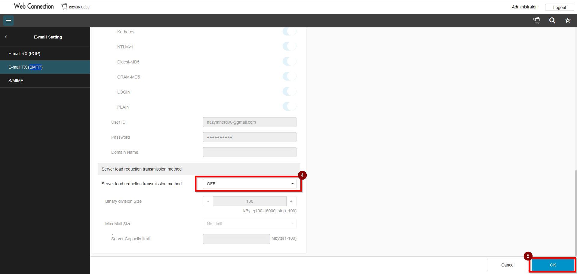 STEP 3 – Select [Network] – [Email Setting] – [Email TX (SMTP)]. Scroll down and set Server Load Reduction Transmission Method to [OFF] then click [OK] to save the settings.