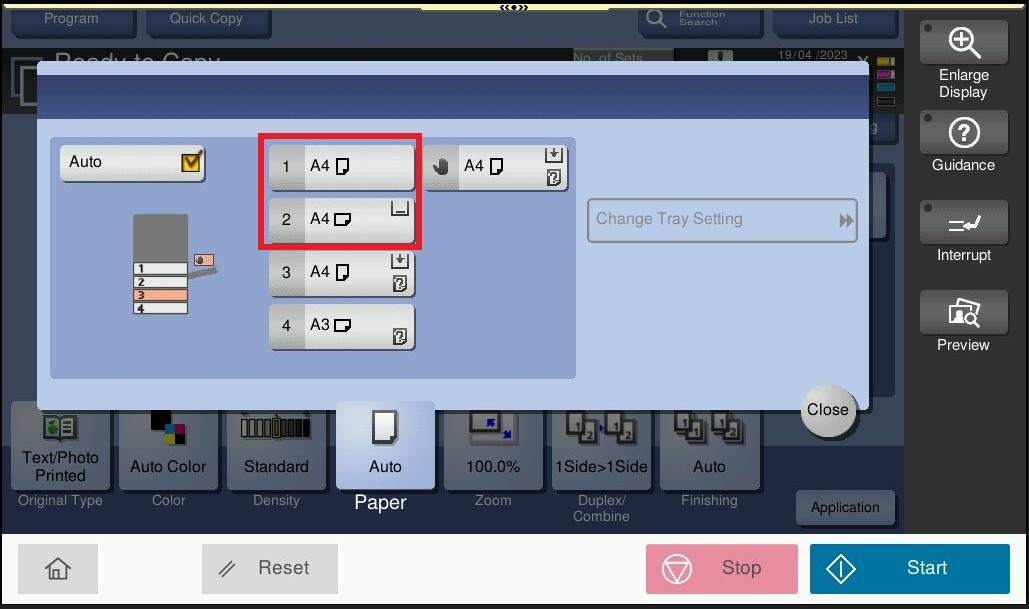 • Machine Tray orientation – Paper of same size and type is loaded in the transversal and longitudinal orientations. For example, if want to print A4 paper, the tray 1 need to put in A4 paper and portrait orientation while tray 2 put in exactly same paper size and paper type as tray 1 but in landscape orientation.