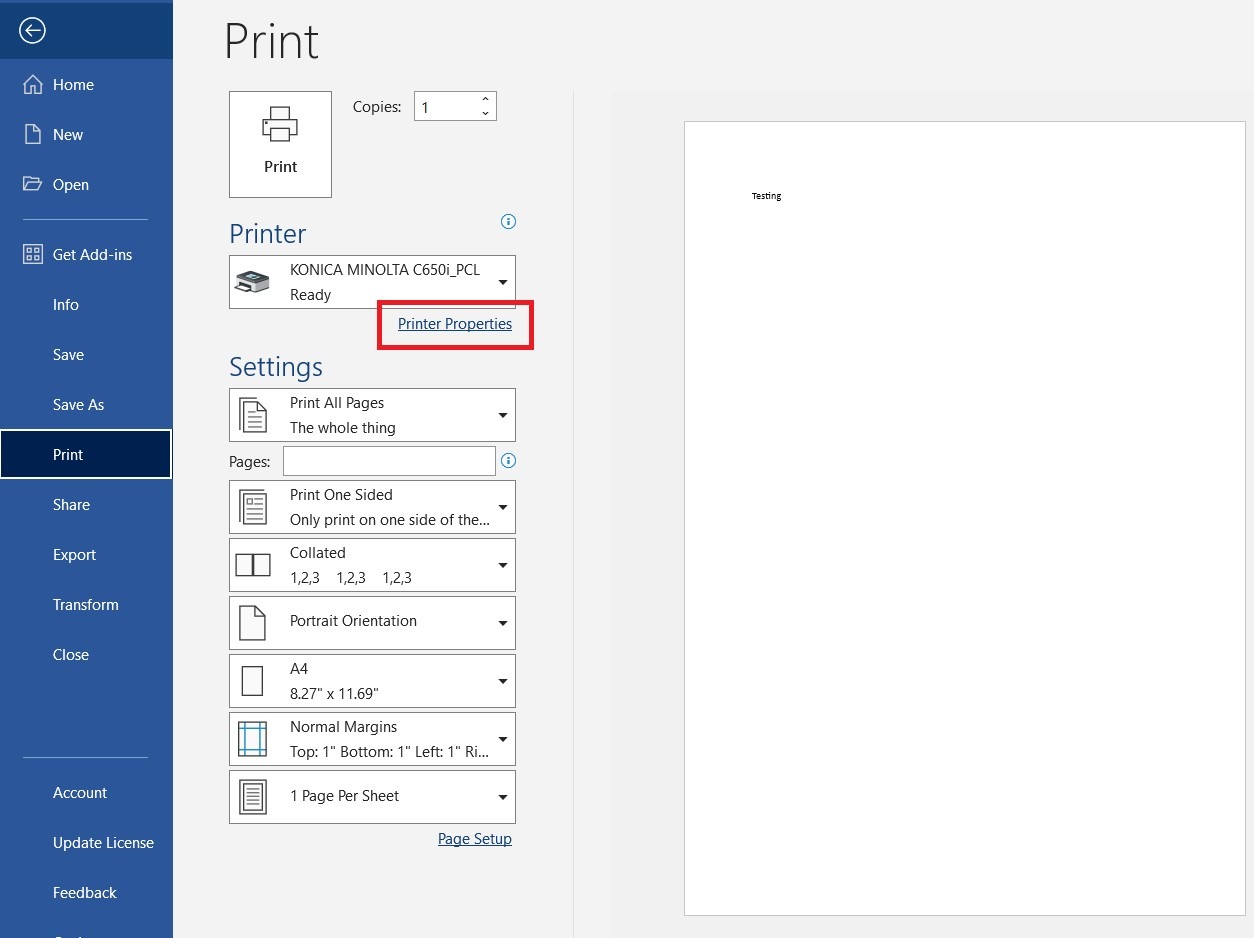 Step 1 – Open a document and select Printer Properties before printing.