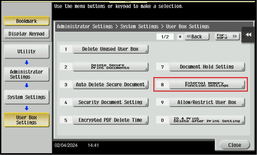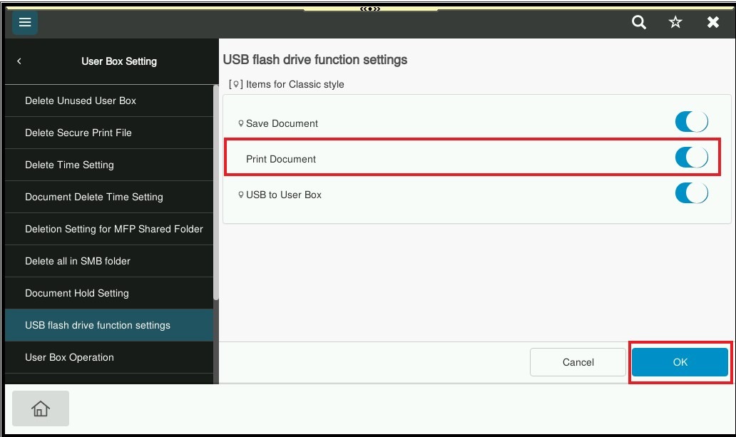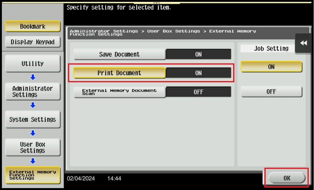 STEP 7 – Make sure that the Print Document is ON then click OK to save it, once ON the Print from External Memory will appear on the screen after the thumb drive has been plugged in.