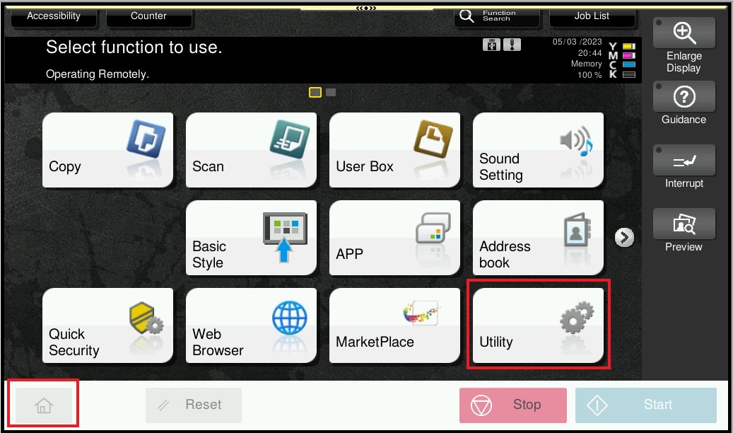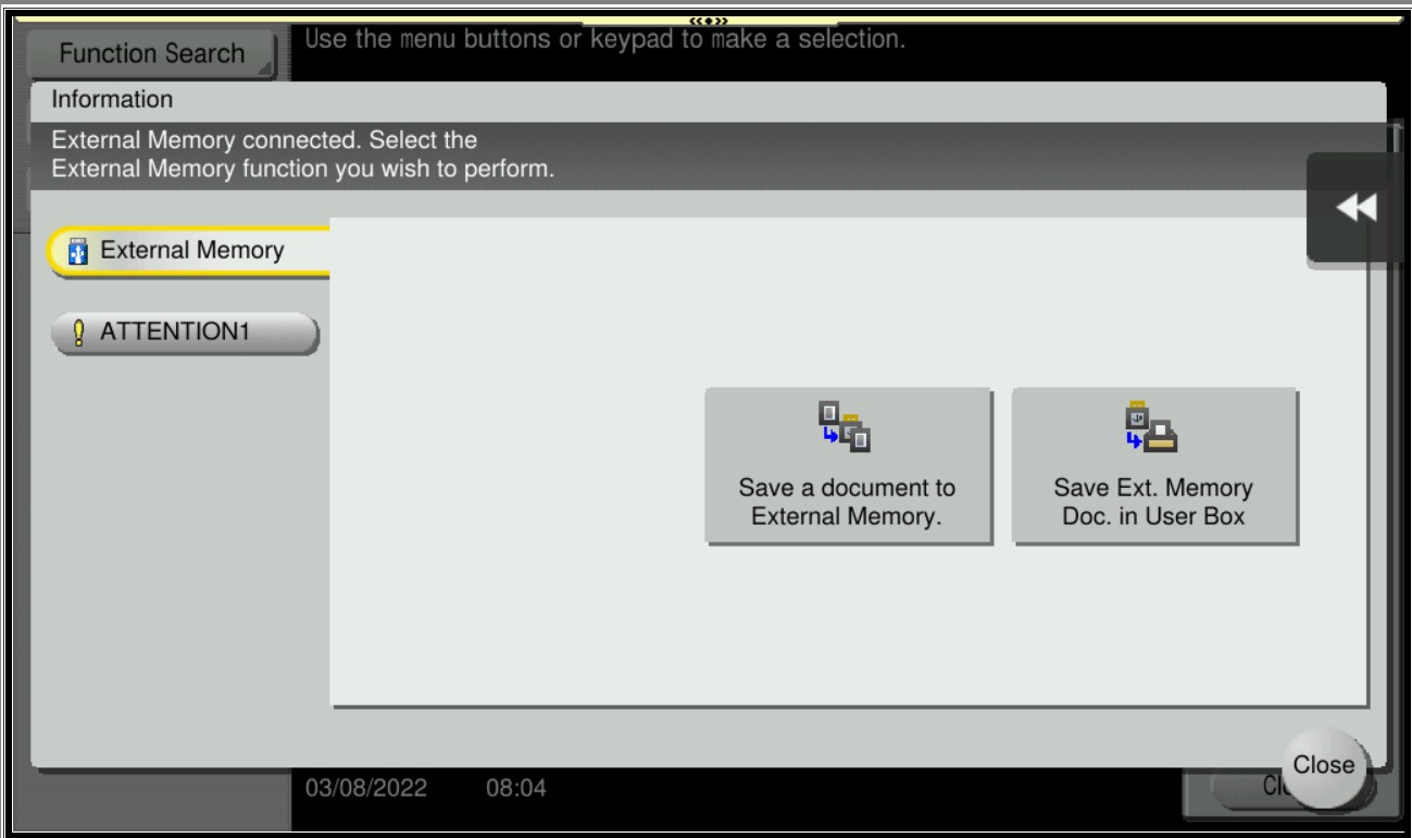 Print from External Memory option is missing after plugging-in the Thumb Drive on the machine. In this case, the function is not enable on the machine, kindly follow the guide below on how to enable the option.
